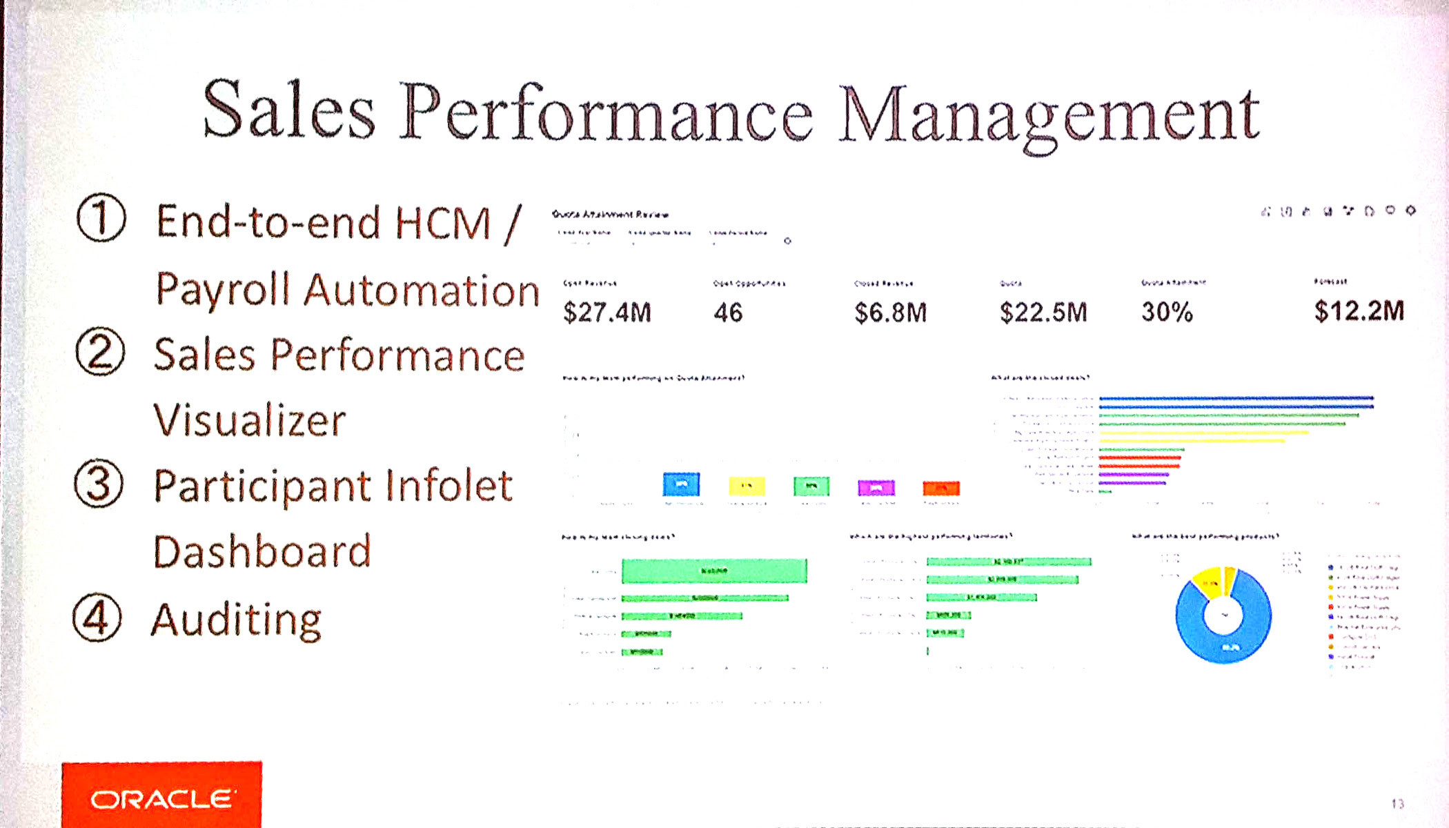 Oracle has one of the most complete SPM solutions (Gartner recognise it as one of the 4 leaders in the SPM magic quadrant). With R12 and R13, most of the improvements and enhancements will be visible on the incentive compensation side of the solution. There will be end-to-end Sales Cloud - HCM/Payroll automation, a sales performance visualizer and auditing among other things.